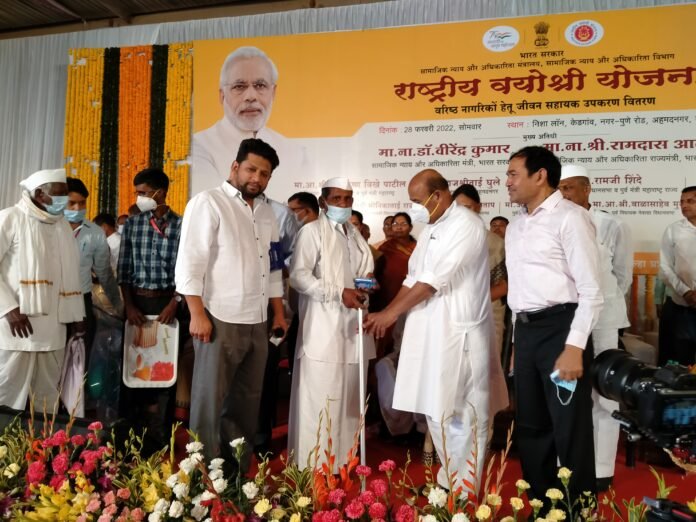 भारताचे पंतप्रधान नरेंद्र मोदी यांच्या संकल्पनेतून राष्ट्रीय वयोश्री योजनेअंतर्गत सहाय्यक साधने वाटपाचा कार्यक्रम सामाजिक न्याय व सक्षमीकरण मंत्री डॉ. वीरेंद्र कुमार यांच्या उपस्थित अहमदनगर शहरातील निशा लॉन्स या ठिकाणी पार पडला.