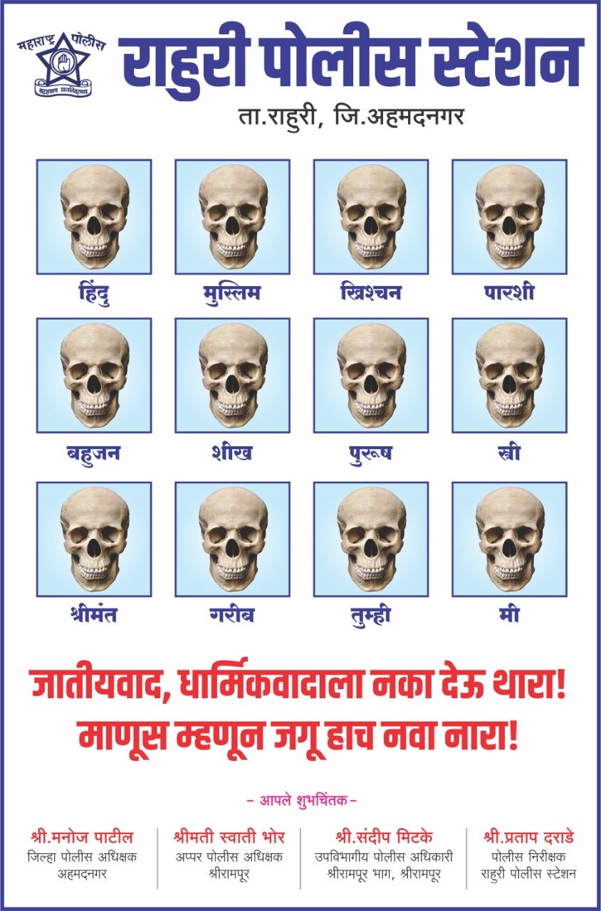 या सर्व गोष्टी लक्षात घेऊन आणि सध्याचे वातावरण पाहून अहमदनगर जिल्ह्यातील राहुरी पोलिसांनी एक चांगली संकल्पना अमलात आणली असून विविध मानवी कवट्यांच्या खाली धर्म लिहले आहेत आणि आपण सर्व एकच आहोत हे सांगण्याचा प्रयत्न एका भित्ती पत्रकाद्वारे करण्यात आला आहे .