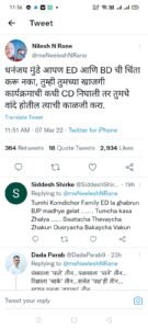 काल धनंजय मुंडे यांनी बोलताना ईडीची किंमत शेतकऱ्यांच्या खिशातल्या विडीसारखी झालीय, अशी टीका भाजवर केली होती.त्या टीकेला निलेश राणे यांनी ट्विट करता उत्तर दिले असून आता तुमची पर्सनल सीडी बाहेर आली तर वांदे होतील असा इशारा निलेश राणे यांनी दिलाय.