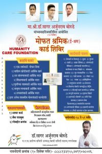 अहमदनगर महानगर पालिकेचे नगरसेवक आणि स्थायी समिती सदस्य डॉ. सागर बोरुडे यांच्या वाढदिवसानिमित्त ११ डिसेंबर रोजी हुमानिटी केअर फाऊंडेशन च्या वतीने मोफत श्रमिक कार्ड शिबिराचे आयोजन करण्यात आले आहे. - या श्रमिक कार्ड चा फायदा शेतकरी,शेतमजूर,सुतार कुंभार,न्हावी,आशासेविका,अंगणवाडीसेविका,अंगणवाडीमदतनीस,भाजीपालावफळविक्रेते,बांधकामकामगार,दूध व्यावसायिक,लेबर कामगार,गाडीचालक, लोहार,पेंटर,प्लंबर,इलेक्ट्रिशियन,पशुपालन करणारे सेल्समन,किराणा/बेकरी/पानपट्टी,सेन्ट्रीग कामगार वीटभट्टी काम करणारे,नाभिक,घरगुती कामगार ,वृत्तपत्र विक्रेते,हातगाडी ओढणारे,ऑटो रिक्षा