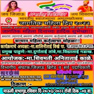 माऊली सभागृहात २० मार्च रोजी सायंकाळी चार वाजता अत्यंत भव्यदिव्य असा संस्मरणीय कार्यक्रम होणार असून कर्तृत्ववान महिलांचा सन्मान ,खाद्य पदार्थांची रेलचेल आणि खेळ पैठणीच्या कार्यक्रमातून बक्षिसांची लायलूट करण्याची संधी आशा कार्यक्रमाला सर्व महिला भगिनींना उस्थितीती लावावी असे आवाहन कार्यक्रमाच्या अयोजका शिवमती अनिताताई काळे यांनी केले आहे.