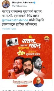अशातच शिवसेनेचे उपनेते आणि माजी खासदार शिवाजीराव आढळराव पाटील यांनी देखील सोशल मीडियावर एकनाथ शिंदे मुख्यमंत्री झाल्यानंतर त्यांनी शुभेच्छा दिल्या. यामध्ये त्यांनी ‘गर्जत राहील आवाज हिंदुत्वाचा अभिनंदन मुख्यमंत्री साहेब’ असं म्हटलं आहे. तसेच या पोस्टमध्ये आढळराव पाटील यांनी मुख्यमंत्री उद्धव ठाकरे यांचा कुठेही फोटो टाकला नाही.