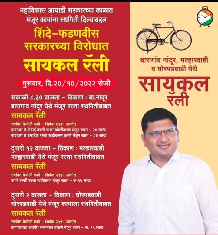 मात्र ग्रामीण भागातील लोकांना शेतकऱ्यांना दुचाकी वर गावातल्या दूध डेरी पर्यंत जायला तसेच गावातील पेशंट शहरी भागात नेण्यासाठी रस्त्याअभावी अडचणी होतात. महाविकास आघाडी सरकारने ही लोकभावना लक्षात घेऊन मंजूर केलेल्या सुमारे 7 कोटी रुपयांच्या ग्रामविकास विभागाच्या निधीला या शासनाने स्थगिती दिली आहे.