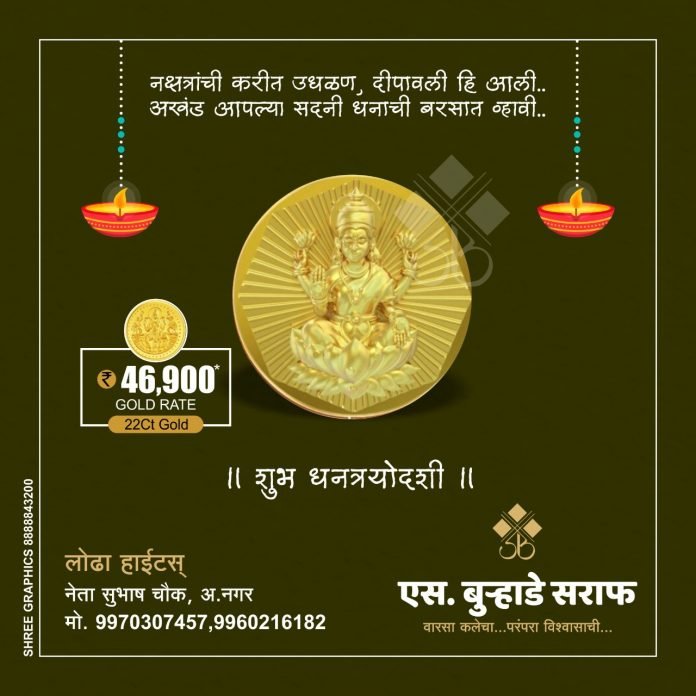 धनत्रयोदशी म्हणजेच धनतरेस (Dhanteras). धनत्रयोदशी दिवशी सोने- चांदीची खरेदी केली जाते. यंदा धनत्रयोदशीला सोने-चांदी खरेदीसाठी चांगली संधी आहे. कारण अहमदनगर मधील एस.बुऱ्हाडे ज्वेलर्स घेऊन आले आहेत नगर मधील ग्राहकांसाठी खास ऑफर जुन्या सोने दागिन्यांच्या वजनात घट न धरता नवीन दागिने बनवून घ्या अशी ग्राहकांना फायदायची ऑफर या ठिकणी मिळू शकते.