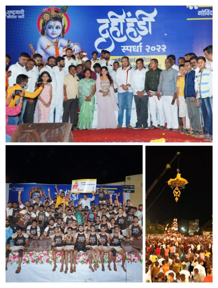 श्री नागेश विद्यालयात सुरू झालेल्या दहीहंडी उत्सवाला नागरिकांनी मोठी गर्दी केली होती. राष्ट्रवादी काँग्रेसचे गीत व आ. रोहीत पवार यांच्यावरील गीतावर उपस्थित जनसमुदायने ठेका धरला होता. नागरिकांच्या या प्रेमामुळे आ. रोहीत पवार भारावले व त्यांनी गर्दीत जाऊन ठेका धरला यावेळी काही कार्यकर्ते यांनी आ. रोहीत पवार यांना उचलून घेतले. सुमारे साडेचार तास चाललेल्या दहीहंडी फोडण्यात कळंबोली नवी मुंबई पथकाला यश आले त्यांना आ. रोहीत पवार व मराठी सिने कलाकार बानू फेम इशा केसकर यांच्या हस्ते एक लाख एक हजार एकशे अकरा रुपये पारितोषिक देण्यात आले.