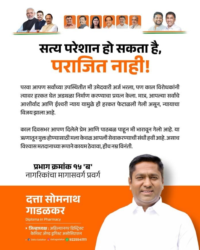 अहिल्यानगर महानगरपालिका निवडणुकीच्या अर्ज छाननीच्या दिवशी केडगाव उपनगरात प्रचंड राजकीय नाट्य पाहायला मिळाले. प्रभाग क्रमांक १५ मधील भाजपचे उमेदवार सुजय मोहिते आणि दत्ता गाडळकर यांच्या उमेदवारी अर्जावर विरोधी उमेदवारांनी हरकती घेतल्याने दिवसभर तणावाचे वातावरण होते. अखेर तब्बल ७ ते ८ तासांच्या मॅरेथॉन सुनावणीनंतर निवडणूक निर्णय अधिकाऱ्यांनी रात्री ११वाजुन ४७ मिनिटांनी या हरकती फ `टाळून लावत दोन्ही अर्ज वैध ठरवले. छाननी प्रक्रियेदरम्यान प्रभाग १५ ‘ब’ आणि ‘ड’ मध्ये राजकीय वातावरण चांगलेच तापले होते. भाजपचे अधिकृत उमेदवार सुजय मोहिते आणि दत्ता गाडळकर यांच्या विरोधकांनी आक्षेप घेतले होते. निवडणूक निर्णय अधिकाऱ्यांसमोर दोन्ही बाजूंच्या वकिलांनी जोरदार युक्तिवाद केला. निकाल काय लागणार, याची उत्सुकता शिगेला पोहोचली होती. निवडणूक कार्यालयाबाहेर दोन्ही गटांच्या समर्थकांनी मोठी गर्दी केली होती. कोणताही अनुचित प्रकार घडू नये आणि कायदा-सुव्यवस्थेचा प्रश्न निर्माण होऊ नये, यासाठी पोलिसांनी केडगावमध्ये कडेकोट बंदोबस्त तैनात केला होता. निकालाची प्रतीक्षा करत असलेल्या कार्यकर्त्यांमध्ये दिवसभर उलटसुलट चर्चा सुरू होत्या. मात्र अखेर दोघांच्याही अर्जावरील हरकती निवडणूक अधिकाऱ्यांनी फेटाळून लावत त्यांचे अर्ज वैध ठरविले. त्यामुळे या दोघांसह त्यांच्या समर्थकांनी सुटकेचा निश्वास सोडला.