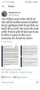 गुजरात काँग्रेसला मोठा धक्का बसला आहे. गुजरात काँग्रेसचे नेते हार्दिक पटेल यांनी पक्षाच्या सर्व पदांचा राजीनामा दिला आहे. अनेक दिवसांपासून ते पक्षावर नाराज असल्याच्या चर्चाही राजकीय वर्तुळात सुरु होत्या. गुजरातमधील विधानसभा निवडणुकीला अवघे काही महिने शिल्लक असताना हार्दिक पटेलच्या राजीनाम्याने काँग्रेसला मोठा धक्का बसला आहे. ट्विट करत त्यांनी याबाबद माहिती दिली आहे.