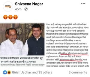 तर शिवसेनेने आपल्या अधिकृत फेसबुक पेजवर मागील विधानसभा निवडणुकी नंतर खा. सुजय विखे यांच्या बाबत आलेल्या काही बातम्यांचा उल्लेख करत रागाचे इमोजी टाकून निवडी बाबत नाराजी दर्शवली असल्याचे दिसून येत आहे. तर काही शिवसेनिकांनी उद्धव ठाकरे यांचे फोटो सोशल मीडियावर टाकून त्यांचा अभिनंदन केले. त्यामुळे शिवसेनेतही दोन प्रवाह दिसतात तर काँग्रेसचे नेत्याने विखे पाटलांचा निवडीबाबत पेढे वाटल्याने काहींच्या भुवया उंचावल्या आहेत.