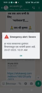 गुरुवारी सकाळपासून मोबाईल फोनवर इमर्जन्सी अलर्ट मेसेज येण्यास सुरुवात झाली असून भारतीय दूरसंचार विभागाच्या वतीने हे अलर्ट देण्यात येत आहे. मात्र का देण्यात येत आहेत याबाबत अद्यापही माहिती मिळाली नसून अचानकपणे आपल्या मोबाईल फोनच्या स्क्रीनवर अलर्ट मेसेज येतो आणि एक वेगळीच रिंगटोन वाजायला सुरुवात होती “हा भारत सरकारच्या दूरसंचार विभागाकडून एक चाचणीचा इशारा आहे” असा अशयाचा मेसेज सकाळपासून अनेक लोकांच्या मोबाईलवर इमर्जन्सी अलर्ट चे मेसेज आले असून नेमकं काय करावे हे अनेक मोबाईल धारकांना समजले नाही.
